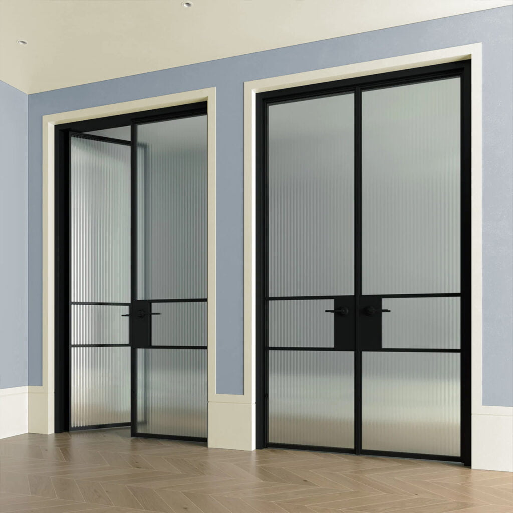 Discover the designs we use in our industrial doors and partitions. You will find transparent, smooth and frosted glass, brown and graphite glass, as well as fluted (striped decorative) and wired glass. The different types of glazing differ in terms of their finish, level of light diffusion and therefore level of privacy.